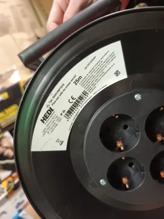 Alargador de cable industrial HEDI de 25 metros con 4 tomas - Longitud del cable: 25m - Número de tomas: 4 - Tipo de enchufe: Europeo - Fabricado en Alemania Disponible dos unidades, precio por unidad Nuevo sin estrenar con precinto y caja Precio original en Amazon 55€