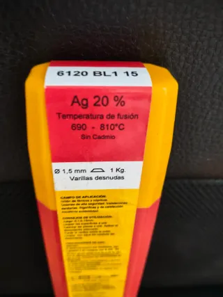 Varillas de soldadura de plata Castolin con un 20% de plata. Ideales para uniones de metales férreos y cúpricos.Incluye bote de decapante. - Composición: Ag 20% - Temperatura de fusión: 690 - 810°C - Sin Cadmio - Diámetro: 1,5 mm - Peso: 1 Kg. - Tipo: Varillas desnudas