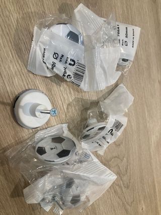 Se venden 6 pomos para muebles con diseño de balón de fútbol. Son ideales para dar un toque divertido a cajones o armarios. - Diseño de balón de fútbol. - Fabricados en España. - Diámetro de 50mm.