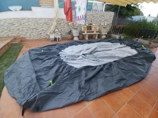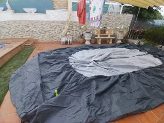 Lona de gran tamaño, ideal para cubrir caravana o vehículo. Tiene una abertura rectangular, se aprecia en la tercera foto - Color gris oscuro. - Material resistente. - Ribete verde en el borde.