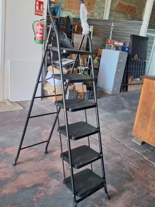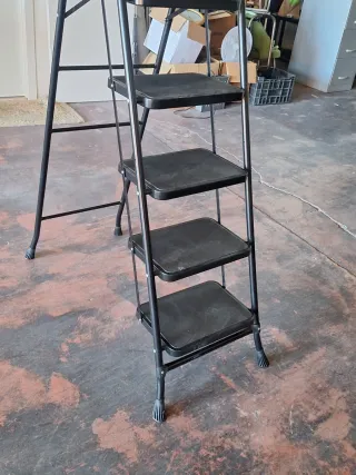 Escalera plegable de cuatro peldaños, ideal para tener en casa o en el taller. Es fácil de guardar y transportar. - Estructura metálica resistente. - Peldaños antideslizantes.