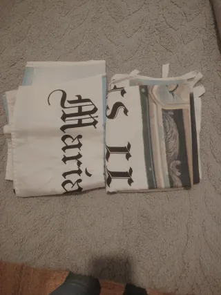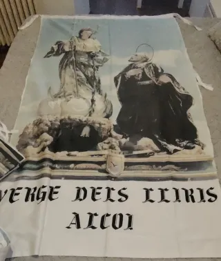 Tapiz religioso con la imagen de la Verge dels Lliris de Alcoi. (2Unidades) - Diseño detallado con figuras religiosas. - Texto VERGE DELS LLIRIS ALCOI en la parte inferior.