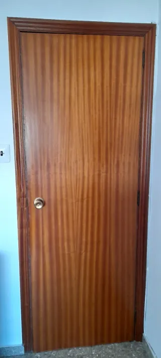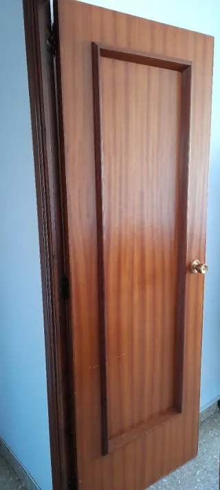 Se venden un total de ocho puertas de madera. Cinco de ellas son puertas normales y las otras tres incluyen vidrio. - 5 puertas de madera normales. - 3 puertas de madera con vidrio. 15€/puerta, incluye pomo con pestillo integrado. Opción de incluir el marco