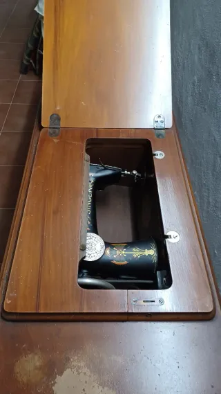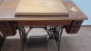 Mesa de madera para máquina de coser Singer, con su estructura metálica original.con cabezal de plata - Diseño clásico. - Cajones laterales. - Base de pedal.