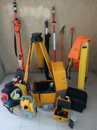Se vende equipo completo de topografía, ideal para profesionales del sector. - Trípode amarillo. - Estación total. - Prisma. - Niveles. - Accesorios varios.