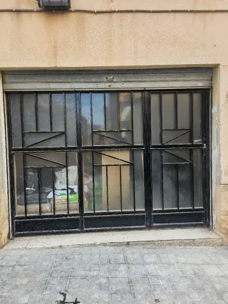 Puerta de hierro con un diseño de rejas. - Estructura metálica. - Paneles de vidrio.