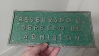 Placa de "RESERVADO EL DERECHO DE ADMISIÓN". Placa metálica e informativa con letras en relieve y pintura color verde. Con desgaste típico del paso del tiempo y una bonita pátina. Aún se puede limpiar y hacer que sea más atractiva. Pieza rescatada in situ en un local emblemático de Madrid donde estaba expuesta. Parece tener muchos años e historia. Peso: 525g aprox. Medidas: Anchura 29 cm Altura 1 cm Profundidad 13 cm *Conseguida en... (+ Info x privado)