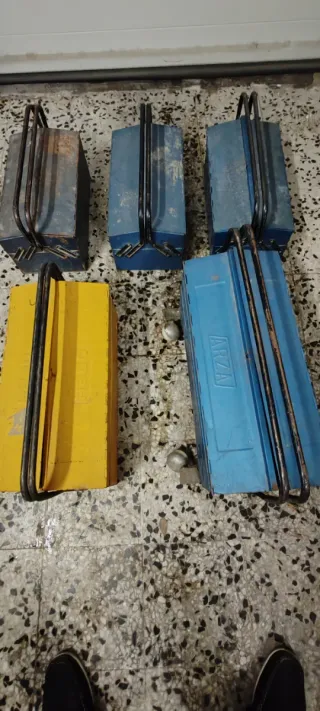 Conjunto de cinco cajas de herramientas metálicas, ideales para organizar y transportar tus herramientas. - Fabricadas en metal resistente. - Diseño clásico con asa para facilitar el transporte. - Colores disponibles: azul y amarillo.