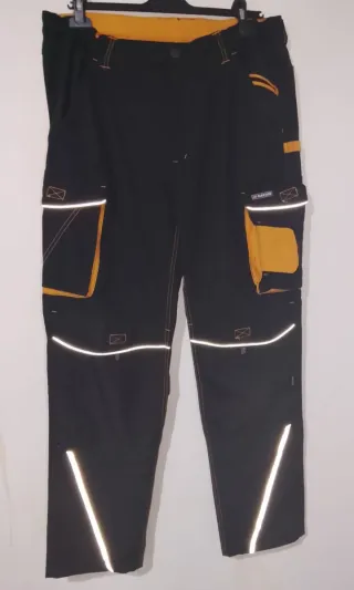 Pantalón de trabajo de color negro con detalles en color naranja y elementos reflectantes. - Bolsillos laterales. - Cintura elástica. - Costuras reforzadas.