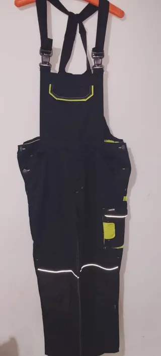 Mono de trabajo de color negro con detalles en color verde lima y elementos reflectantes. - Tirantes ajustables con clips. - Bolsillos laterales. - Bolsillo en el pecho con logo. - Detalles reflectantes en piernas.