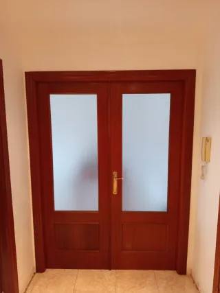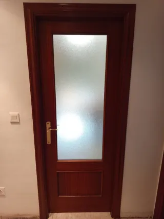Conjunto de puertas de madera para un piso completo. Ideales para renovar tu hogar. - Acabado en madera oscura. - Diseño con paneles inferiores y cristal esmerilado superior. - Incluye manillas doradas. Hay 3 de habitación una doble de salón y una acristalada para cocina con las jambas. Medidas cocina y habitaciónes 72x2,3m salon 1,45x2,3m