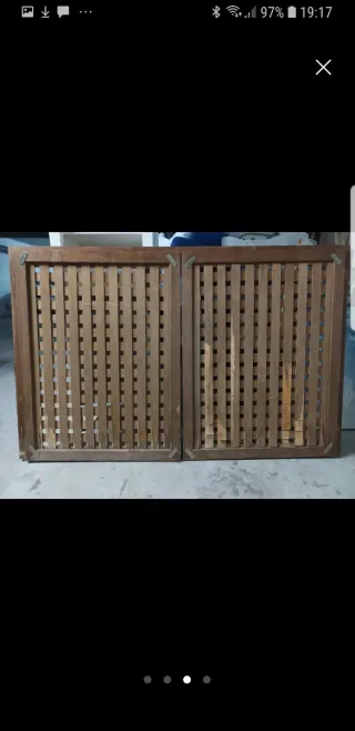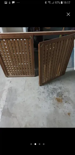 Se venden dos puertas frontales de madera con diseño de listones. Celosia, incluye marco. Mide 157 de largo por 100 alto - Material: Madera. - Diseño: Listones entrecruzados.