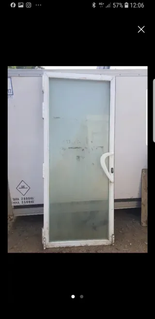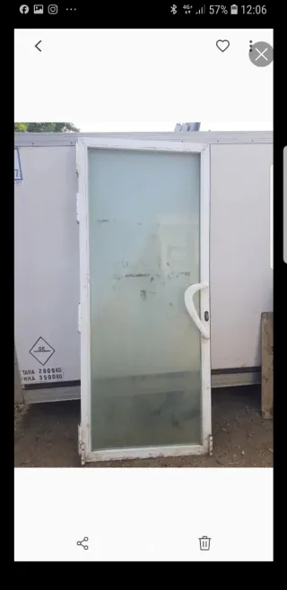 Puerta de aluminio blanco con cristal translúcido y manilla. Incluye llave, no tiene marco. Mide 87 x 210 cm. Abre a la derecha. Incluye bisagras. - Marco de aluminio blanco. - Cristal transparente - Manilla blanca.