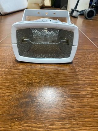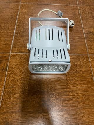 Este foco reflector cuenta con una carcasa blanca y un interior reflectante. - Materiales: vidrio, metal y plástico.