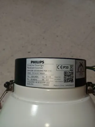 Foco empotrable Philips CoreLine, modelo DN125B. - Potencia: 24W. - Tipo de LED: 20S/840 PSR VWH. - Voltaje: 220-240V. - Frecuencia: 50-60Hz. - Corriente: 0.13A. - Factor de potenci a: 0.9. - Fabricado en China.