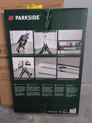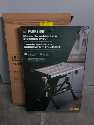 Mesa de soldadura plegable y móvil de la marca Parkside. Es fácil de transportar gracias a sus ruedas. - Superficie de trabajo: 570 x 150 mm. - Altura de trabajo aprox.: 735-900 mm. - Carga máx.: 150 kg.