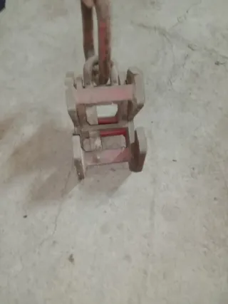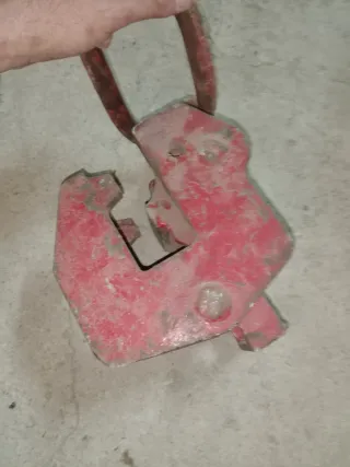Enganche de grúa de color rojo, diseñado para levantar cargas pesadas. Su estructura metálica ofrece durabilidad. - Color: Rojo. - Material: Metal.