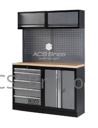 ARMARIO SUPERIOR ALYCO 192848 DESCRIPCION: Armario para parte superior de conjunto de taller acoplable a panel perforado y pilares, de estructura metálica con chapa de acero de 0,8mm y estructura metálica de 1mm. Tiene un compartimento con puerta que se abre hacia arriba, con pistones de gas para una suave apertura. El armario está fabricado en acero por lo que es muy sólido en su estructura. Las partes del armario están pintadas con pintura epoxi, al horno electrolítico. Altura mínima de colocación: 1,65 metros. Solución para almacenar herramientas, documentación, herramienta electroportátil, etc. Forma parte de los conjunto ...