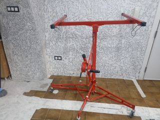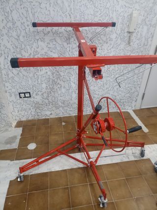 Herramienta para levantar placas de yeso o pladur,profesional. - Estructura de metal rojo. - Ruedas para facilitar el desplazamiento. - Mecanismo de manivela para elevación.