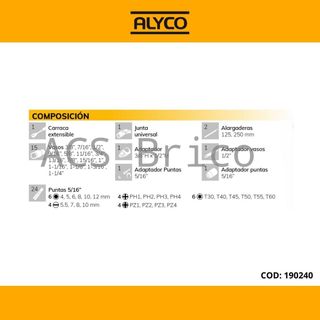JUEGO LLAVES DE VASO DE 1/2" DE 47 PIEZAS ALYCO 190240 Juego de llaves de vaso de 1/2" de 47 piezas en pulgadas fabricado en Cr-V. máxima durabilidad y resistencia al desgaste las herramientas están cromadas para darles la mejor protección posible contra la oxidación. Esto aumenta por encima de los estándares DIN la resistencia de las herramientas y su capacidad de apriete La carraca es de alta precisión gracias a su preciso mecanismo El juego incluye un maletín de plástico con cierre metálico y bisagras reforzadas Ideal para cualquier trabajo mecánico profesional o de bricolaje por la variedad y cantidad de accesorios que con...