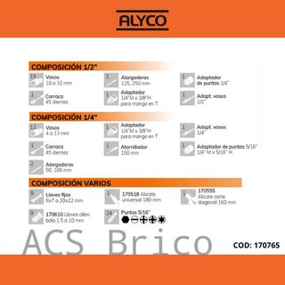 JUEGO LLAVES DE VASO DE 1/2", 1/4" Y 3/8" DE 171 PIEZAS ALYCO 170745 Capacidad de apriete casi infinito de tuercas hexagonales (desde 4 hasta 32 mm.) y aprietes de ranura, PH, PZ, Torx, etc. con puntas. Conjunto de herramientas de apriete mediante vasos hexagonales con 3 carracas, de cuadradiillo de 1/4", 3/8" y 1/2", y vasos desde 4 a 32 mm, apto para infinidad de tareas de apriete. Carracas de muy fácil manejo, y larga vida. Muy aptas para mantenimiento industrial, taller de automoción, incluso para bricolaje casero. Gran trasmisión del esfuerzo, por las capacidades de las carracas de mecanismo preciso de 72 dientes, acodada...