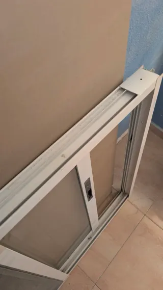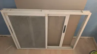 Ventana corredera de aluminio con marco blanco. Incluye una sección con mosquitera. - Marco de aluminio blanco. - Una hoja con mosquitera. - Una hoja de cristal. -medidas 117x88cm