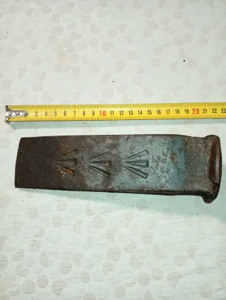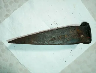 Herramienta antigua para trabajar la madera. - Forma de cuña. - Material metálico con óxido visible.