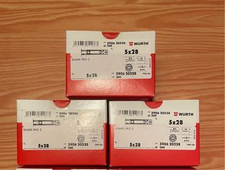 Se vende 3 cajas de tacos de montaje Wurth Shark Pro. - Modelo: Shark Pro 5 - Medida: 5x28 mm - Cantidad: 600 unidades - Marca: Wurth