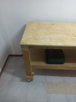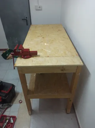 Mesa de trabajo robusta con morsa incluida, ideal para talleres o garajes. - Superficie de tablero aglomerado. - Estructura de madera resistente. - Morsa de sujeción de metal rojo.