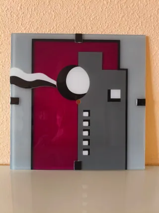 Pieza de cristal con un diseño moderno y abstracto. Medidas 30 CTS. Grosor cristal 4 milímetros. Agujero en el centro( era un reloj de pared) - Combinación de colores: gris, burdeos y blanco. - Elementos geométricos y curvos. - Acabado brillante.