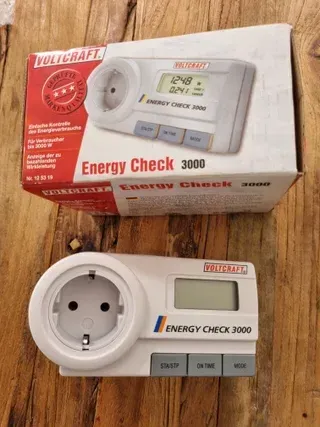 Medidor de consumo eléctrico Voltcraft Energy Check 3000. Permite controlar el gasto energético de aparatos de hasta 3000W. - Pantalla digital. - Botones de control: STA/STP, ON TIME, MODE. - Enchufe y toma de corriente integrados.