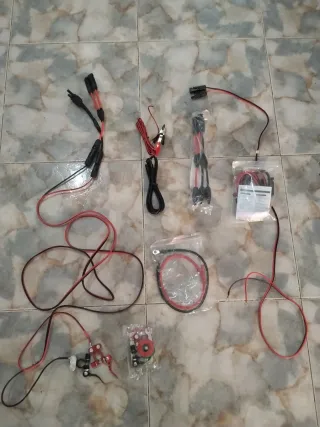 Lote de componentes para sistemas de energía solar. - Cables con conectores MC4. - Pinzas de conexión tipo cocodrilo. - Fusibles y portafusibles. - Terminales de anillo. -3Cables con sus conexiones y su terminación en aro. -4Agarres fácil como era fácil. manipulación a manivela son caras. -Conexion pinza. -Cable load out para controlador solar