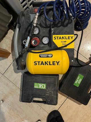 Compresor de aire Stanley con depósito de 5 litros y motor de 1.5 HP. Incluye manguera en espiral y dos maletines. - Depósito horizontal. - Presión máxima: 8 bar. - Incluye dos maletines CSK P06.
