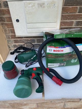 Pistola de pintar Bosch PES 2000. - Incluye unidad de motor, manguera y pistola. - Contenedor de pintura verde. - Contenedor adicional rojo. para piezas motor quemado seguramente
