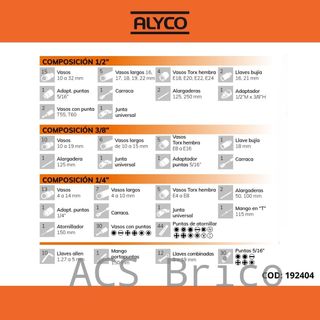 JUEGO LLAVES DE VASO DE 1/2", 1/4" Y 3/8" DE 219 PIEZAS ALYCO 192404 Juego de llaves de vaso de ½”, 3/8" y ¼” de 219 piezas fabricado en acero al Cromo Vanadio, máxima durabilidad y resistencia al desgaste. Las herramientas están cromadas para darles la mejor protección posible contra la oxidación. Esto aumenta importantemente la vida de las piezas y asegura una capacidad de apriete superior a las normas DIN durante una larga vida útil. Las llaves de carraca tienen un mecanismo preciso de apriete, y tienen una larga vida útil. Incluye un maletín de plástico para tener todas las herramientas bien almacenadas y acceder a la dese...