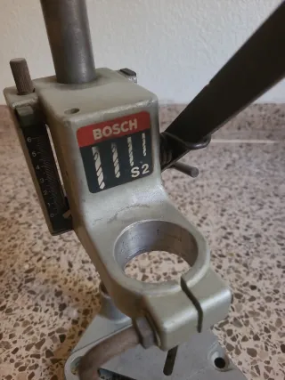 Soporte para taladro de la marca Bosch. Permite fijar el taladro para un trabajo más preciso y seguro. - Base metálica robusta. - Columna vertical ajustable. - Palanca para descenso del taladro.
