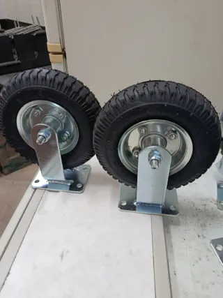 Juego de cuatro ruedas neumáticas con llanta metálica. - Diámetro aproximado de la rueda: 20 cm. - Ancho aproximado de la rueda: 5 cm. Altura de la rueda con soporte 27 cm - dos ruedas con Soporte giratorio metálico. Dos ruedas con soporte fijo - Incluye freno en las ruedas firatorias