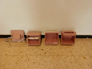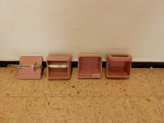 Conjunto de accesorios para el baño en color rosa. - Portarrollos de papel higiénico. - Jabonera. - Dispensador de jabón o loción. - Vaso para cepillos de dientes.