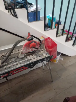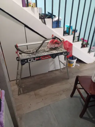 Cortadora de azulejos Rubi DU-200, ideal para trabajos de alicatado. - Disco de corte incluido. - Protector de disco. - Patas plegables para fácil transporte y almacenamiento.