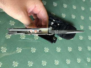 Alicate multiusos de acero inoxidable con un juego de puntas. - Incluye funda de tela negra. - Puntas de diferentes tipos para diversas tareas. - Diseño compacto y portátil.