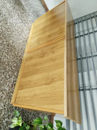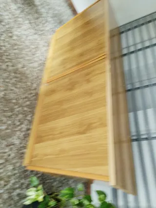 Mostrador de madera con un diseño moderno y elegante. Ideal para negocios o como mueble auxiliar. - Acabado en madera clara. - Superficie amplia y resistente. - Estructura robusta.