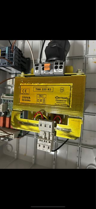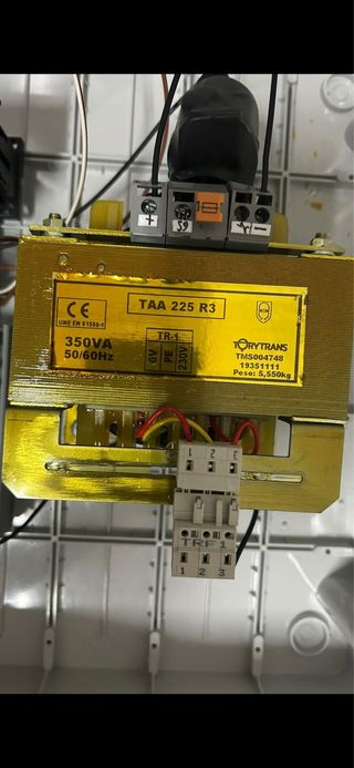 Transformador de potencia TAA 225 R3. - Capacidad: 350VA. - Frecuencia: 50/60Hz. - Modelo: TR-1. - Voltaje: 0V, PE, 230V. - Marca: TORYTRANS. - Peso: 5,550kg.