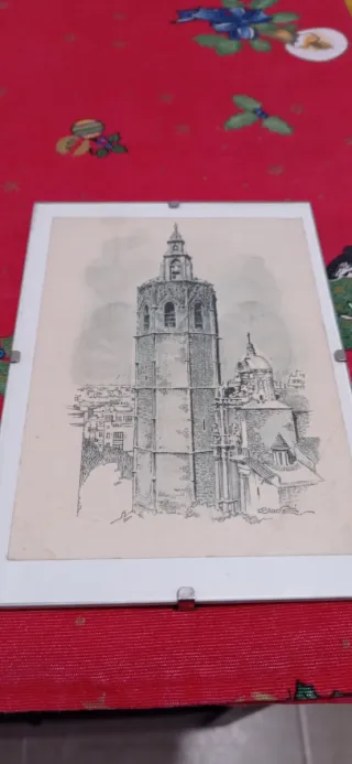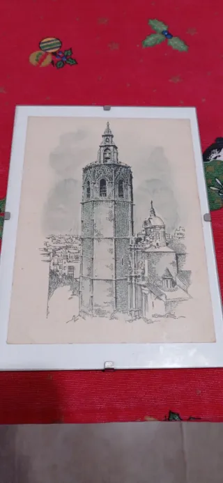 Impresión de, EL MIGUELETE, EN LA CATEDRAL DE VALENCIA con detalles arquitectónicos. - Representación detallada de la estructura. - Incluye elementos de la ciudad circundante. - Firma del artista visible.