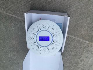 Detector de humos y CO2 con pantalla digital. - Diseño circular blanco. - Múltiples orificios para ventilación. Funciona con pilas
