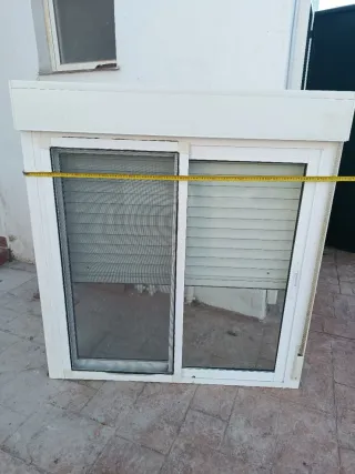 Ventana corredera de aluminio con persiana enrollable. - Marco blanco. - Doble cristal. - Incluye mosquitera.