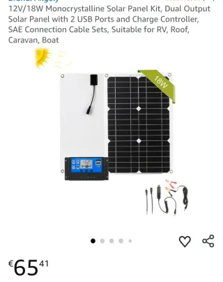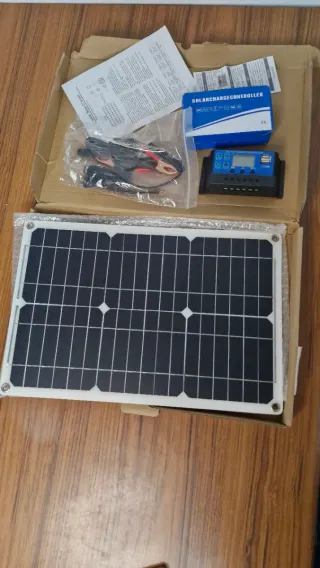 Kit completo para energía solar con panel monocristalino y controlador de carga. - Panel solar monocristalino de 18W y 12V. - Controlador de carga solar dual output.