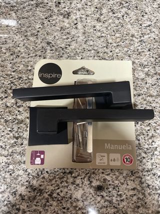 Juego de manillas negras modelo Manuela de la marca Inspire. - Acabado en negro mate. - Incluye tornillería para su instalación. - Garantía de 10 años. - Falta alguna pieza para el montaje porque el compartimento donde vienen incluidas se rajo y se perdieron