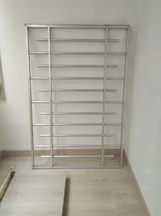 Ventana corredera de aluminio con rejas de seguridad. Ideal para exteriores. - Marco de aluminio blanco. - Dos hojas correderas. - Rejas de hierro forjado con diseño ornamental. Ancho 85cm / Alto 116cm