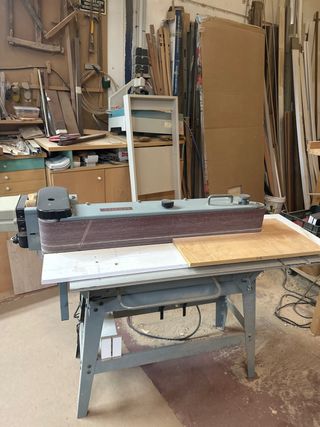 Lijadora de banda para trabajos de carpintería. - Superficie de trabajo amplia. - Estructura metálica robusta.