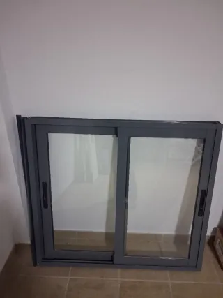 Ventana corredera de aluminio gris con doble cristal Climalit. Ideal para aislamiento térmico y acústico. Nueva a estrenar. - Marco de aluminio resistente. - Doble acristalamiento Climalit. - Diseño moderno y funcional.